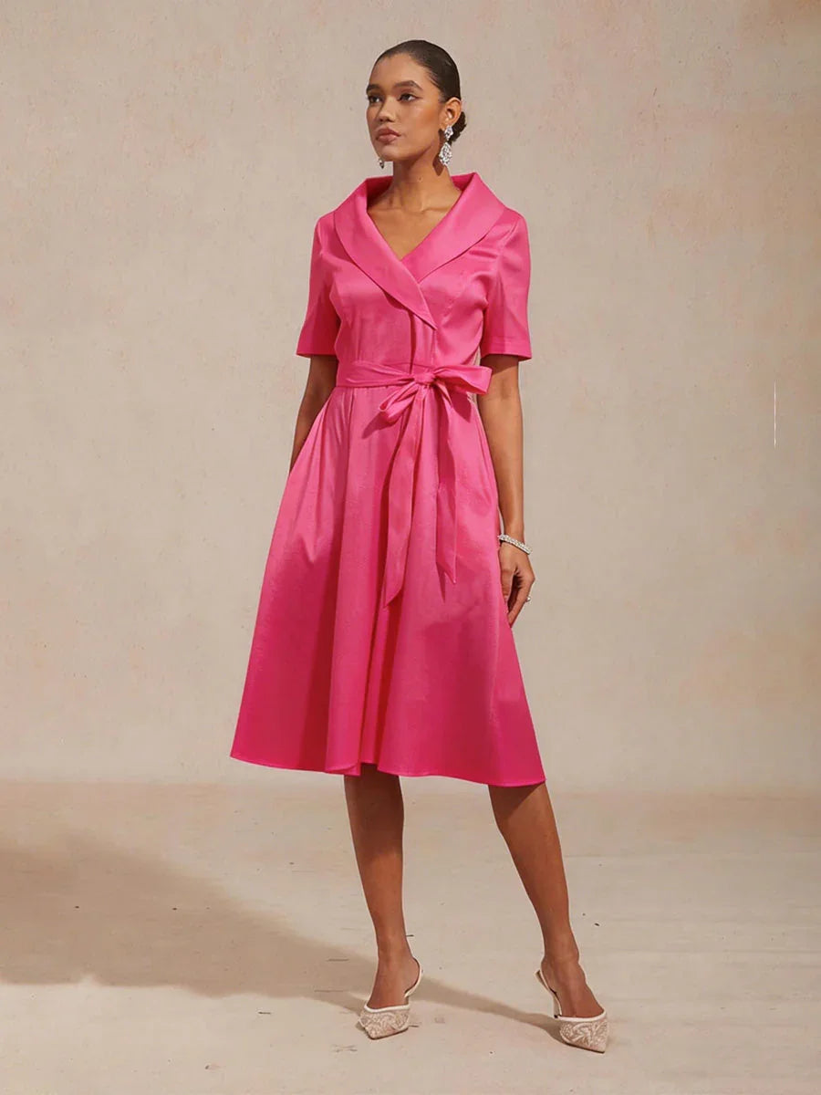 Turn heads in this chic collar stretch taffeta dress, designed with a flattering tie waist belt that cinches your waist beautifully. Crafted from luxurious stretch taffeta, this dress hugs your curves while offering comfort and sophistication. The knee-length skirt and practical pockets make it as functional as it is fashionable. Whether you're stepping out for a wedding, evening party, or a formal dinner, this dress is the perfect choice for any special occasion. Pair with heels and a bold necklace to complete the look and shine at every event.